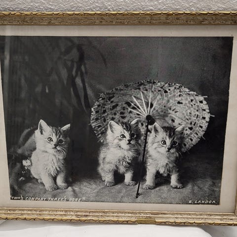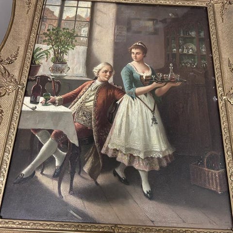 Tavla med motiv av lantlig scen föreställande personer och hundar i utomhusmiljö. Bilden är monterad i en dekorativ ram med blommönstrade rutor runtom. Baksidan har tryckt mönster och upphängningsögla. Passar som väggdekoration i hemmet eller som del i en samling av äldre inredningsföremål.