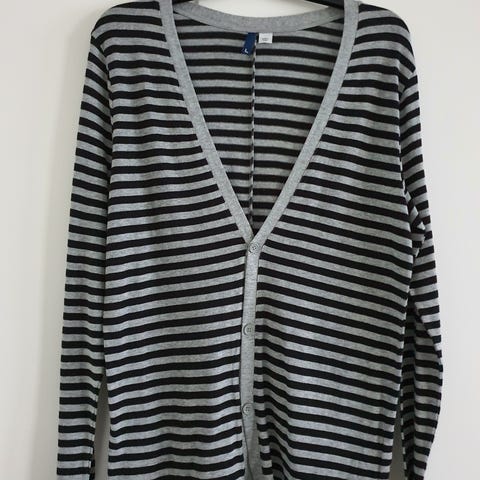 Vit och marinblå randig kofta med V-ringning och knäppning framtill.