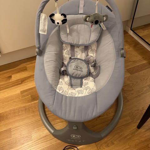 Beemoo babysitter i grått tyg med vadderad sits och sele. Babysittern har en oval form med stabil ram och båge upptill för eventuell leksakshängare.