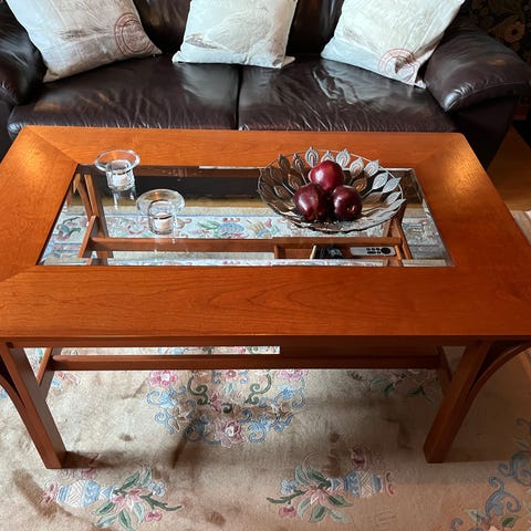 Soffbord och 2 sidobord med glasskiva, mahogny