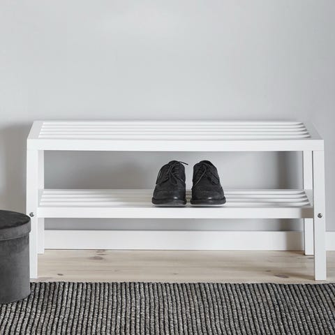 Hallbänk med en vadderad sits i konstläder och två praktiska hyllor i metall med plats för ytterskor. Färgen är samma som på bilden.