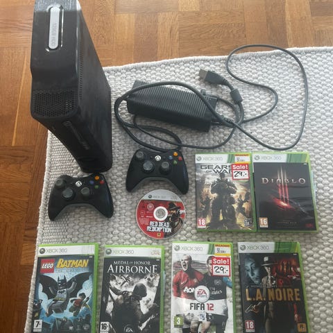 Xbox 360 med tillhörande spel och två kontroller.