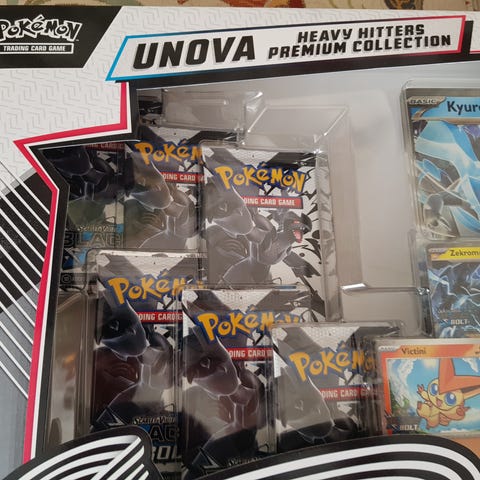 Denna Pokémon Trading Card Game-samling är en Unova Heavy Hitters Premium Collection. Den innehåller föremål från Black & White-serien. Samlingen inkluderar promokort, ett överdimensionerat kort och boosterpaket. Boosterpaketen är från Black & White Bolt Flare och White Flare-utgåvorna. Ny men liten skada på framsidan enligt bilden.