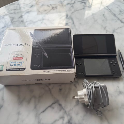 Nintendo DSi XL handhållen spelkonsol i svart färg. Modellen är en bärbar spelkonsol i Nintendo DS-serien med två skärmar, där den nedre är pekskärm. Konsolen har inbyggd kamera, högtalare, mikrofon, styrkors och knappar för spelkontroll. Det finns plats för spelkassett till Nintendo DS samt uttag för laddare och hörlurar. Passar för spel anpassade till Nintendo DS-systemet. Konsollen går även att "modda/hacka"