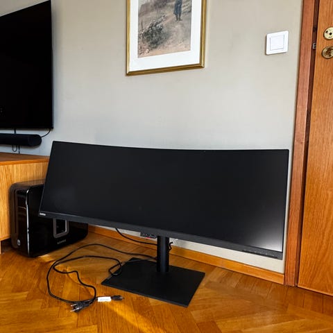 MSI välvd datorskärm med 34 tum skärmstorlek i svart utförande. Skärmen har en böjd design som ger bred bildyta, lämplig för arbete, spel och film. Den står på ett stativ med tre ben och har anslutningar och reglage placerade på baksidan. Passar för stationär datoranvändning på skrivbord i hem eller kontor.