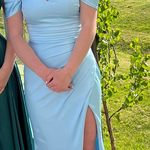 Klänningen är insydd för att sitta perfekt. Den är även uppsydd och passar någon som är runt 160 cm. Den är mer uppsydd framtill för att slippa trampa på klänningen och är lite längre fall där bak. Jag köpte klänningen för ca 4800kr.