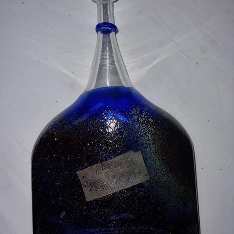 Ljushållare i blått glas med infattning av metalltråd. Hänget är dekorerat med små pärlor i blått och rött. Passar som dekoration hängandes i ett fönster eller på väggen.