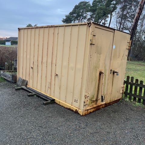 Blå stålcontainer med dörr och mindre fönster på ena sidan. Containern är avsedd för förvaring eller enklare bodlösning och står på marknivå. Ytterväggarna är korrugerade i metall för ökad stabilitet. Passar exempelvis som förråd, verktygsförvaring eller tillfällig arbetsbod på byggarbetsplats eller gård. Råst skader finns men går o fixa om man vill. Måste hämtas med kranbil. 6000 kr eller bud med rätten att nekas