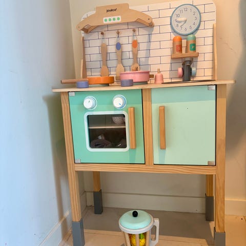 Leksakskök i trä med grytor,kaffemaskin,brödrost mm enligt bild.