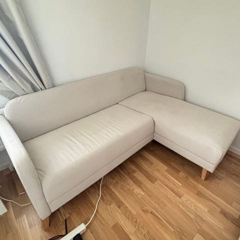 Överdraget syns att det är använt men går att köpa nytt på Ikea om man vill byta ut. Inga stora fläckar! Går att ha kvar befintlig klädsel.