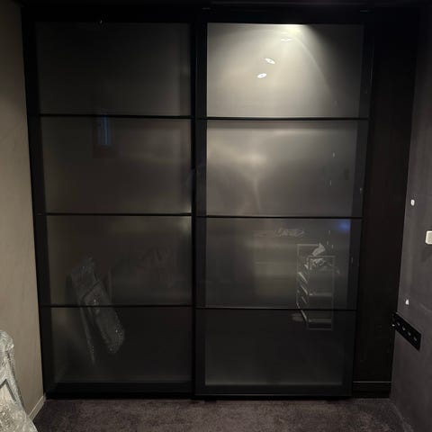 Dörrarna är i nyskick, utan repor eller skador. Kompletta med tak- och golvskenor.