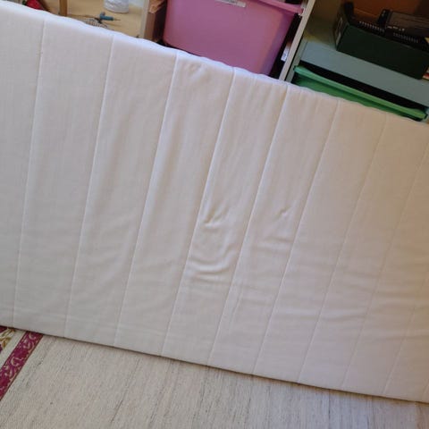 IKEA madrass i ljus färg. Vågformat mönstrad yta och kant med mörkare tyg. Passar till sängram i motsvarande storlek för en sovplats. Lämplig för användning i sovrum eller gästrum som liggunderlag i säng.
