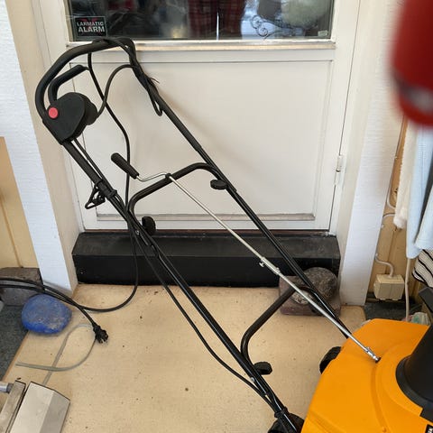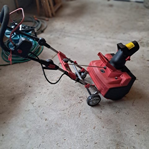 Elektrisk snöslunga i röd färg med två hjul och handtag med reglage. Maskinen är avsedd för snöröjning av uppfarter, gångar och mindre ytor. Utrustad med elanslutning och skyddskåpa över utkastet. Passar för användning där man har tillgång till eluttag och vill röja lättare till medeltjock snö från plana underlag som asfalt eller betong.