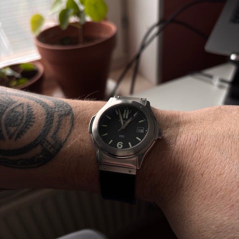 It is an amazing automatic watch. Titanium coated with Dark Grey DLC (Diamond like Carbon) - sapphire glass AR coated - Swiss made movement.