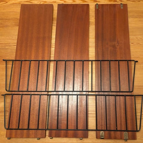 Stringhylla retro i teak och svartlackad metall.