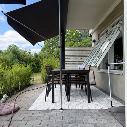 Paviljong med fristående tak i grå färg. Konstruktion i metall med fyra ben. Mått enligt bild: cirka 233 cm djup, 230 cm bredd och cirka 235 cm totalhöjd. Taket ger skydd mot sol och lättare regn och kan användas som tak över uteplats, grill eller förvaring utomhus. Monteras mot vägg eller fristående beroende på placering och behov.