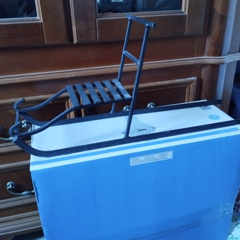 Mekanisk våg med metallkonstruktion och skala för viktmätning. Väger föremål med en plattform ovanpå vågen. Färgen är sliten och vågen har tecken på användning och ålder.