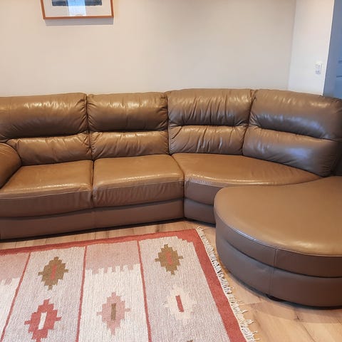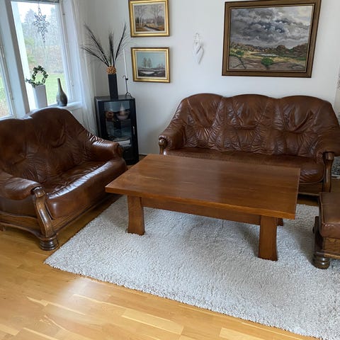 Fin soffgrupp i brunt skinn samt ovalt träbord.