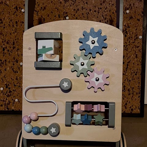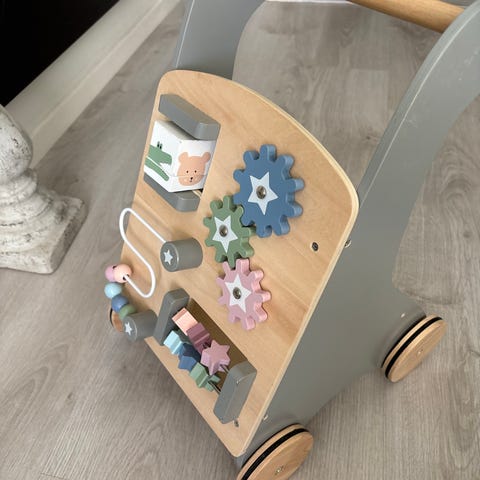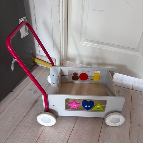 Vagnen är mycket stabil (tillverkad av bok- och björkplywood), har en spännande kugghjulsmekanism och en intressant färgad vridskiva.