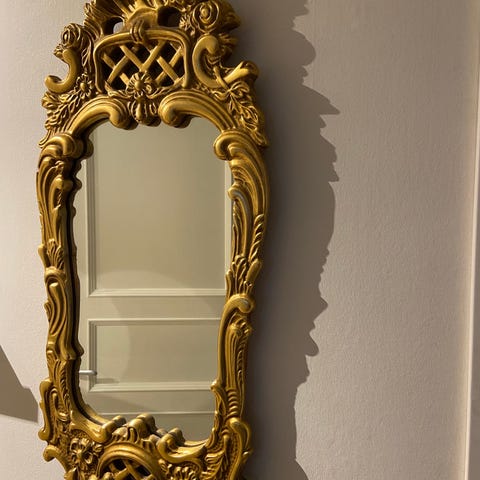 Spegeln har rikligt ornamenterade detaljer med blommotiv och sniderier, särskilt upptill på ramen. Passar exempelvis i hall, sovrum eller vardagsrum som väggspegel eller stående mot vägg.