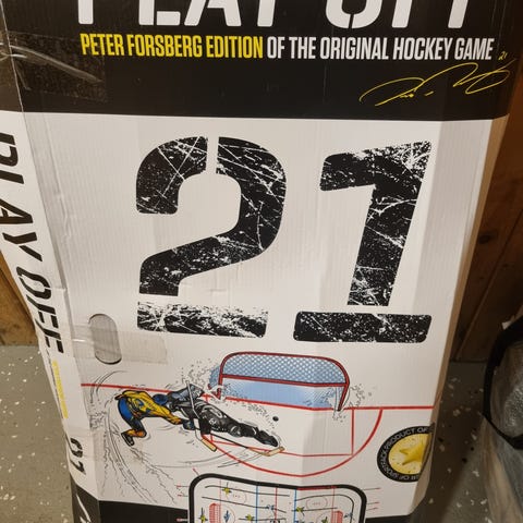 Stiga Play Off ishockeyspel med spelplan i plast och spelare monterade på stänger. Spelet står på benställning och har målburar i båda ändar. På spelplanen finns tryck med olika lag och reklamlogotyper. Till spelet följer en påse med lösa delar och tillbehör, exempelvis extra spelare och puckar. Passar för bord- eller golvplacering inomhus.