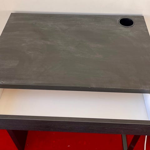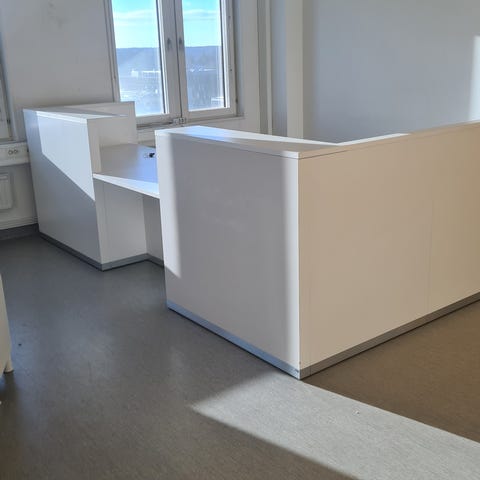 Recepción bord i svart marmormönstrad yta med en utdragbar låda framtill. Överdel med upphöjd bakkant som ger avställningsyta och skydd mot vägg. Bordet har öppen underdel med plats för stol eller förvaring. Passar som arbetsplats, sminkbord eller mindre datorbord i hemmet.