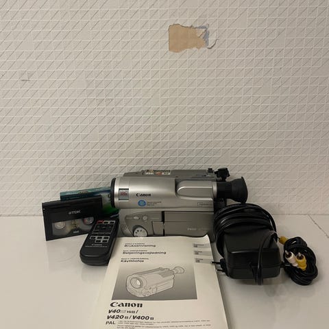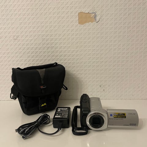 Hitachi videokamera med tillhörande laddare,2 batteri och bärväska. Kameran är en kompakt handhållen modell med inbyggd sökare och rem för handen. Den lämpar sig för inspelning av video i hemmet eller vid resor. Strömadapter och batteri syns på bilderna, liksom en mjuk väska för förvaring och transport.