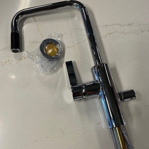 Köksblandare i rostfritt stål med ettgreppsblandare.