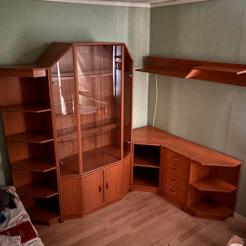 Vitrinskåp med glashyllor samt hylldel båda med belysning och 2 st sidohyllor.