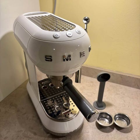 Smeg köksmaskin i grå färg. Maskinen har en stabil bas med infällning för bunke och metallring runt fästet. Överdelen har tydlig Smeg-logotyp och fäste för visp- eller degkrokar. Passar för matlagning och bakning i kök där en fristående köksmaskin behövs.