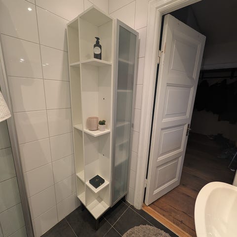 Skåpet ska vara upphängt på vägg, men blev aldrig det hemma hos mig då jag direkt efter inköp insåg att den var för liten. Upphängningslist och beslag ingår.