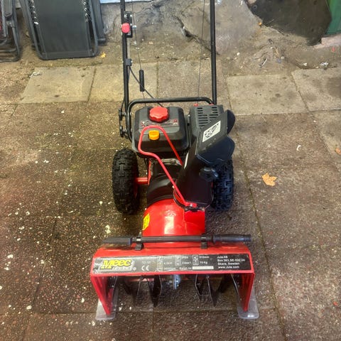 Meec Tools snöslunga i röd färg. Bensindriven modell med hjul och snäckskruv framtill för röjning av snö från uppfarter och gångar. Utrustad med handtag för styrning samt kontrollpanel upptill. Passar för användning vid snöröjning runt bostad, garage och uppfart.