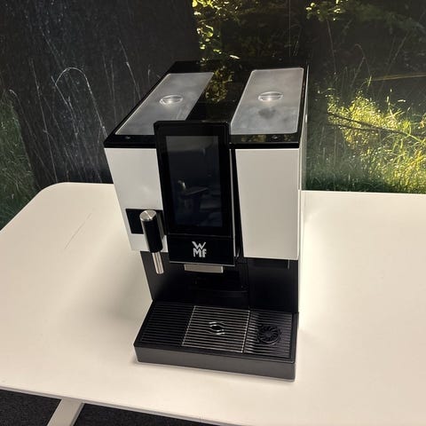 WMF Presto kaffemaskin för bänkplacering. Maskinen har två bönbehållare på ovansidan samt chokladbrhållare och ett frontpanel med display och knappar för val av dryck. Droppgaller och utlopp för kaffe och varmvatten finns på framsidan. Lämplig för kontor, café eller andra miljöer där flera koppar kaffe bryggs löpande. Maskinen är avsedd för hela bönor och har inbyggd kvarn.
