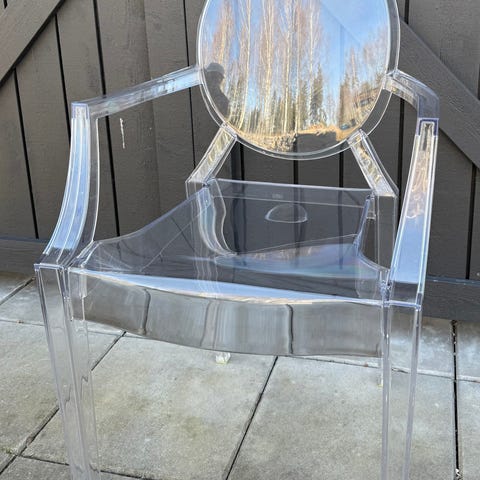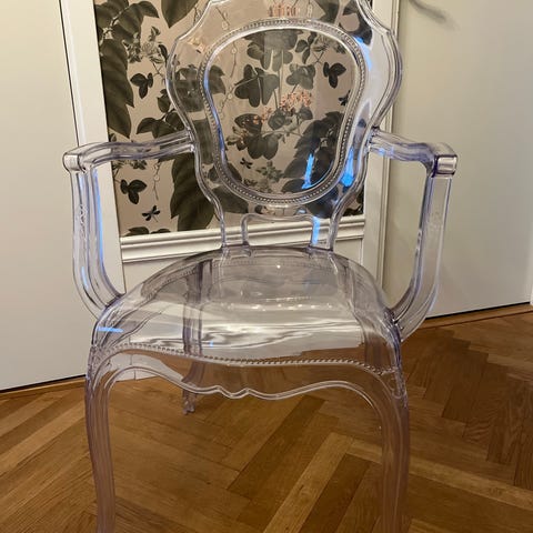 Louis Ghost Kartell karmstol i genomskinlig plast formgiven av Philippe Starck. Stolen har rund rygg, armstöd och sits i klar plast. Passar som matstol, skrivbordsstol eller solitär i vardagsrum, hall eller sovrum. Materialet är formsprutad plast som är lätt att torka av och hålla ren.