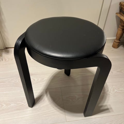 Svartmålad pall i formpressat trä, sitthöjd 45 cm, diameter sits 35 cm.