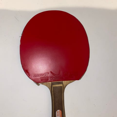 Okej. Säljer ett eget ihoplimmat pingisrack. Detta är nivåer över det du kan köpa på stadium. Jag har haft det på kul och smashat ut massor med folk med det. Den svarta (backhandsidan) har grym skruv så det är ett chinagummi där den röda (forehandsidan) har mer fart. Det ser lite skruppligt ut men jag kan lova dig att det är grymt. Jag har spelat 10 år själv, tävlat och spelat SM och jag har haft det här som ett latchracket. OBS - gummina är köpta separat och limmade på. Det är alltså tävlingsgummin och inte nåt stadium material. Så låt dig inte luras av att det ser ”dåligt” ut för dem här gummina går inte att mäta med stadiums! Bud mottages.
