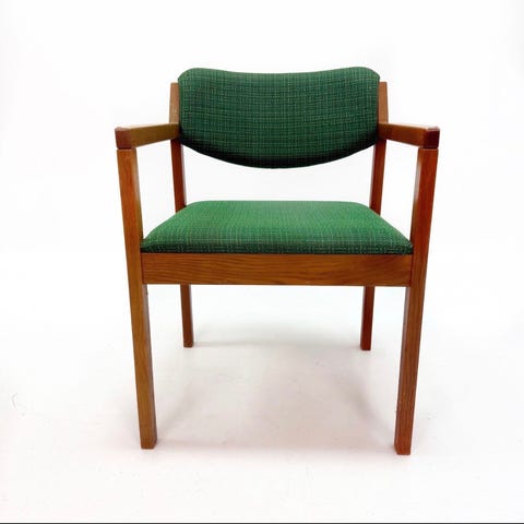 Sannolikt danskt 50/60 tal. Stämplar saknas. Sitthöjden är 58cm. Sitsens mått är 43x47 cm och klädd i konstläder/galon. Sitsen och ryggstödet är vadderat ca 4 cm. Ryggstödet flexar för att ge stöd i svanken. Stolen är stabil och i mycket gott orginalskick för sin ålder och är skön att sitta på. Avhämtning i Skarpnäck