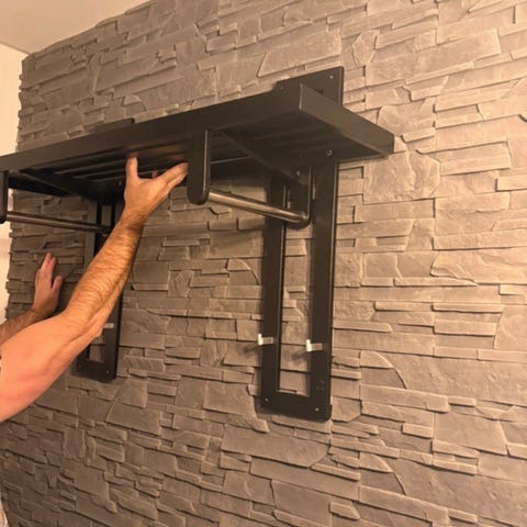 Väggmonterad hatthylla i vitmålat trä. Hylla med spjälor överst, kromstång och 5 kromkrokar. Ca 80 cm bred. Fint skick, inga skador.