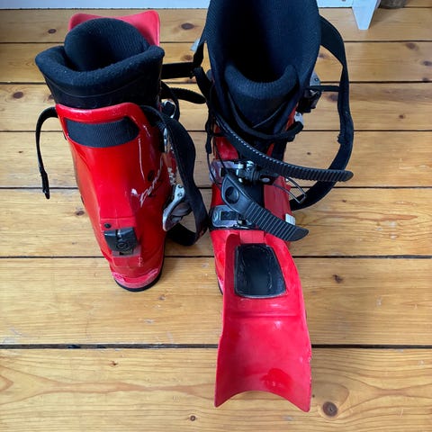 Alpinpjäxor som är lätta att ta av och på för barn då hälen kan vikas bakåt.