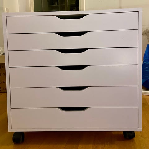 ALEX- Lådhurts vit med 6 lådor. Byrå, arkivskåp, förvaring. Liten reva uppe på knappt synlig (se bild 2) samt lite i ena hörnet (se bild 3)