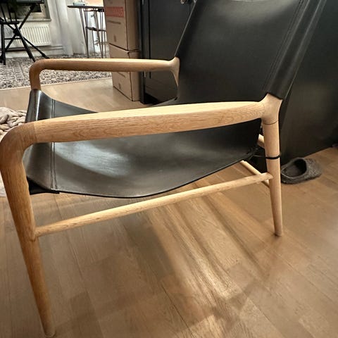 Övriga delar är även de i massiv teak. Sitsen är i konstskinn.