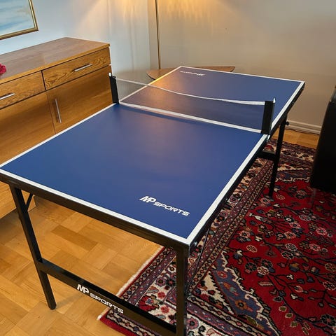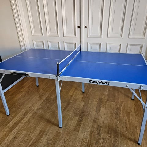 Praktiskt bordtennisbord som tar liten plats. Med hopfällbara ben och justerbara fötter.