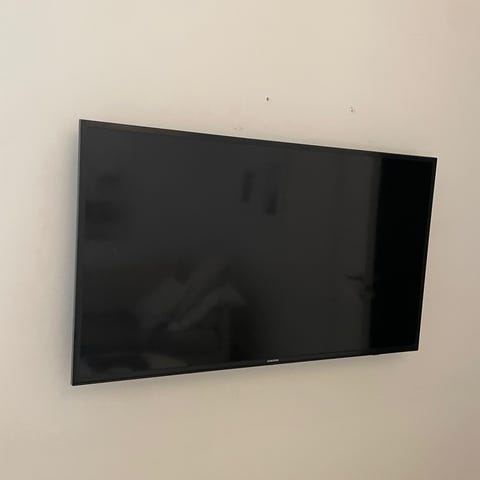 TCL tv i svart färg. Platt skärm med väggfäste på bild samt tillhörande fjärrkontroll.