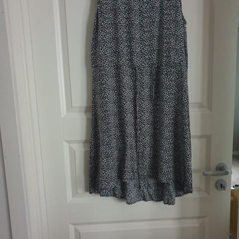 H&M topp i damstorlek storlek 28. Ärmlös modell i polyester med flerfärgat mönster i svart, grått och vitt. Rund halsringning med liten öppning framtill och lätt rynkdetalj vid halsen. Rak passform och knälång längd som kan bäras som längre topp eller kort klänning beroende på längd och passform på bäraren.