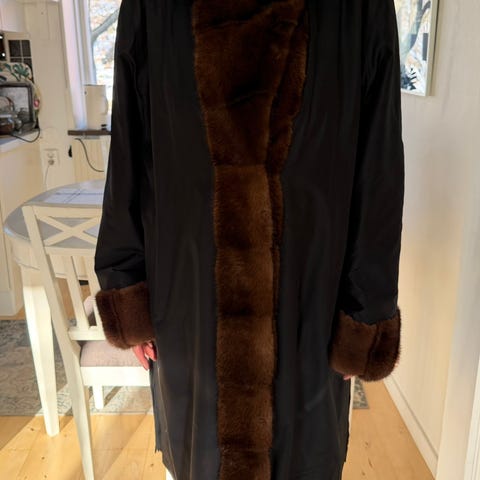Fransk pälskappa för dam i rymlig storlek L. Lång brun päls med krage och hel längd, raka ärmar med uppvik vid ärmslut. Insidan är fodrad med svart tyg. Fodret är lagat . Underbar varm och go