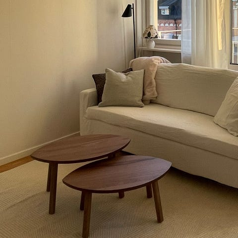 Runt soffbord set i trä i naturfärg. Består av två bord i olika storlek som kan stå delvis under varandra. Borden har runda bordsskivor och raka ben. Passar som soffbord eller sidobord i vardagsrum.