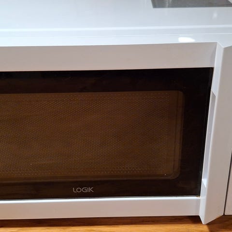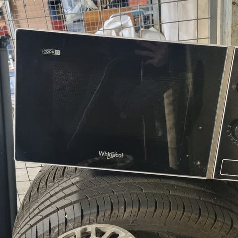 Whirlpool Jet Chef mikrovågsugn i vit färg. Fristående modell med front i glas och kontrollpanel med vred och knappar för olika program och inställningar. Utrustad med roterande tallrik invändigt. Passar för uppvärmning, upptining och enklare tillagning av mat i kök, kontor eller liknande miljöer.