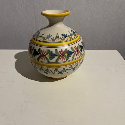 Detta är en Kaiser-porslinsvas, troligtvis från serien Flora, som kännetecknas av sin vita biskvi-finish (omålat porslin) med upphöjda blommotiv och en glaserad insida.
