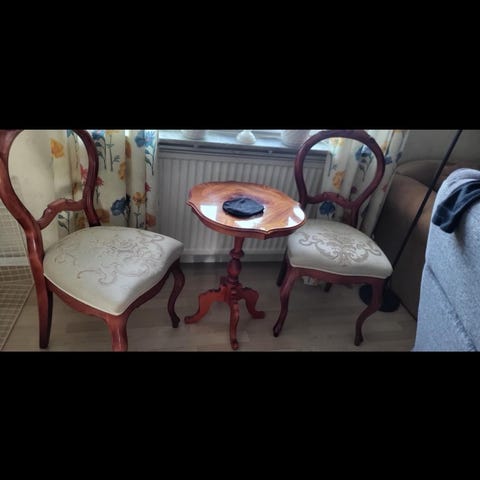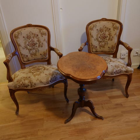 Två fåtöljer i vinröd sammetsliknande klädsel. Rundad rygg och sits med träsockel och ben i trä. Passar som sittgrupp i vardagsrum, sovrum eller hall. Klassisk stil med låg sitthöjd och mjuk stoppning för bekväm sittställning.litet bord med skinn i vinrött.