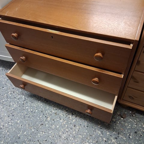Mindre furubyrå med 5 lådor varav 2 delade, runda hörn.